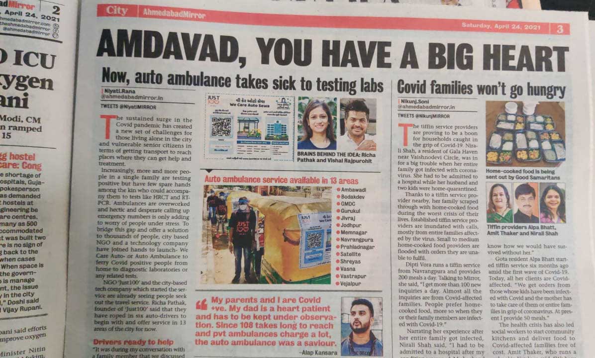 In order to help covid patients and their families cope with food requirements during those times, Just 100 initiated delivering free, hygienic, healthy tiffin right at the patients’ doorsteps.